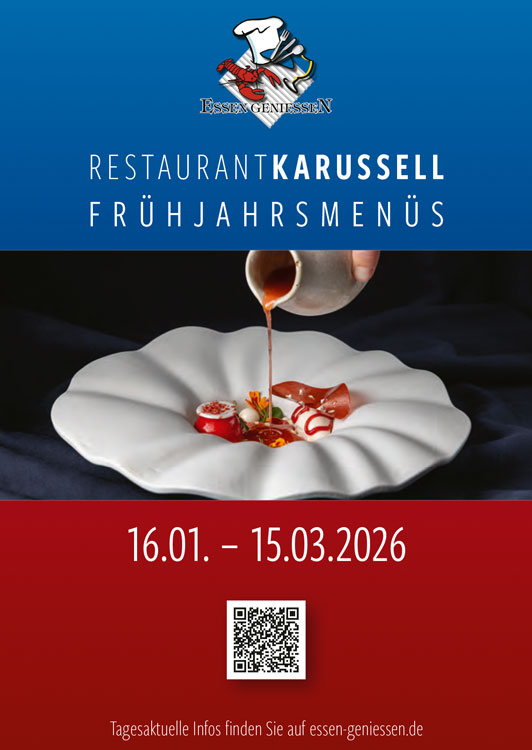 Willkommen beim Restaurant Karussell Die Frühjahrsmenüs16.01.–15.03.2026 Gourmetgenuss im Übblick Alles rund um das Restaurant-Karussell: alle Gastronomen, alle Menüs Jetzt Broschüre downloaden Broschüre laden Unsere Restaurants Bottrop Rosa Dorsten Goldener Anker Duisburg Villa Patrizia Essen Acquario Alte Metzgerei Bliss Casa lodato Davinci Fleischerei Gärtnerei GarPunkt Gummersbach Hannappel 1831 Hugenpoet Kettner's Kamota Kiepenkerl La Grappa Müllers auf der Rü Restaurant M Mumm Pazza Schmachtenbergshof Sengelmannshof Sheraton Essen Stöckmanns tablo Wundertüte Gladbeck Wasserschloss Wittringen Mülheim A.D.R. Walkmühle Oberhausen Hackbarth's Ratingen Liebevoll! Auermühle